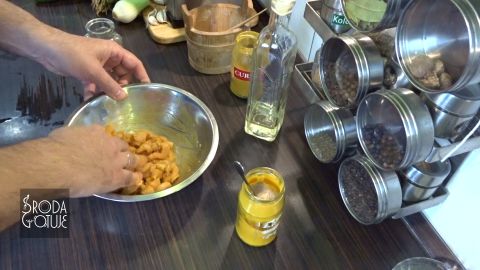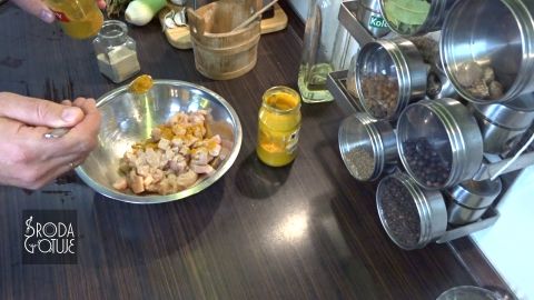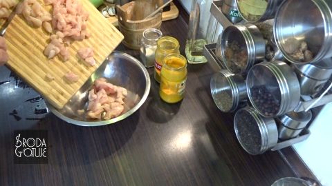 2. Teraz przyprawiamy kurczaka zgodnie ze składnikami powyżej, 2 łyżki oleju, płaska łyżeczka przyprawy Curry, 2/3 łyżeczki Kurkumy mielonej, 1/3 łyżeczki soli, 1/3 łyżeczki białego mielonego pieprzu