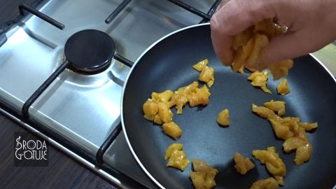 5. Smażymy około 5 minut, tak aby cząstki nieco się zarumieniły. Przesypujemy na miskę (najlepiej metalową) i odstawiamy do ostygnięcia