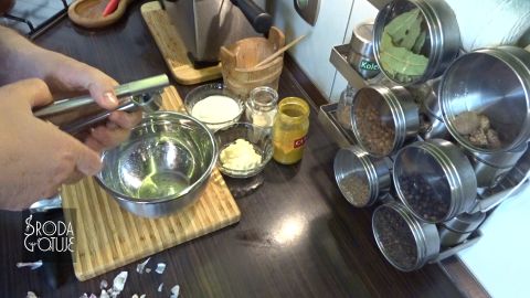 7. Teraz przygotujmy sos: 2 lub 3 ząbki młodego czosnku, 3 łyżki gęstego jogurtu, 3 łyżki gęstego majonezu, 1/3 łyżeczki soli, 1/3 łyżeczki białego pieprzu, 1/2 łyżeczki przyprawy Curry