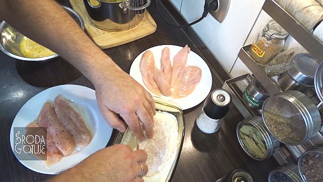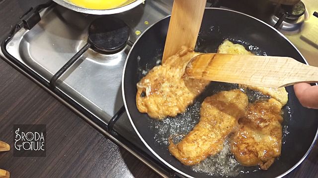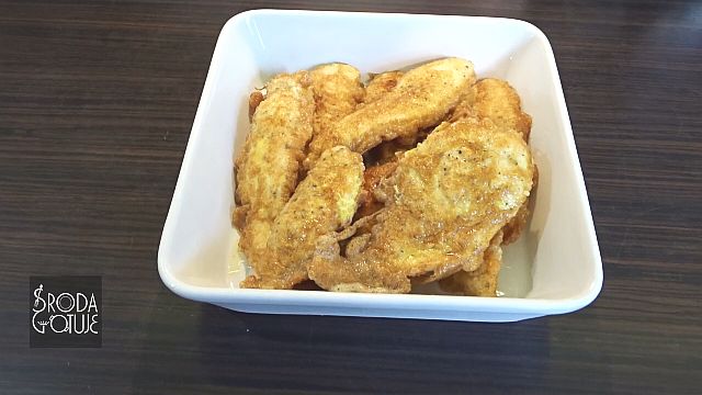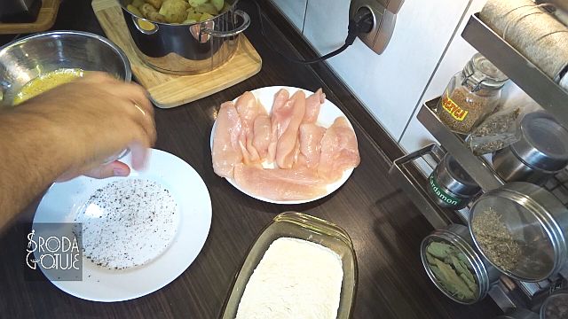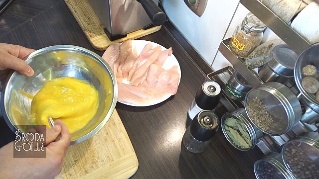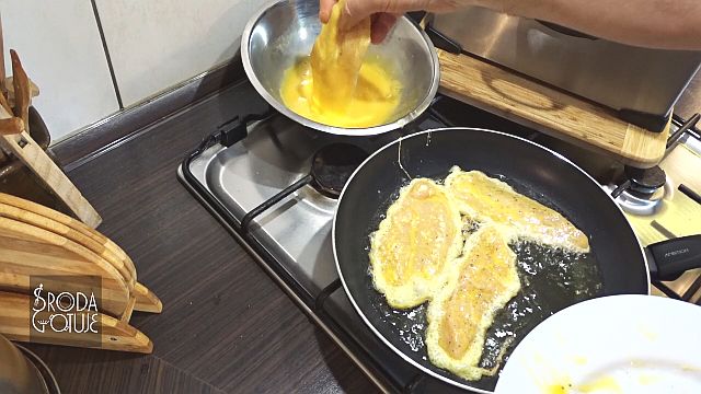 8. Gdy tłuszcz jest dobrze rozgrzany, każdą część przygotowanego kurczaka zatapiamy w jajku i szybko kładziemy na patelnię.