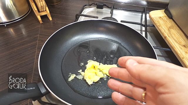 4. Na patelni dobrze rozgrzewamy 2 łyżki oleju i łyżkę masła klarowanego.