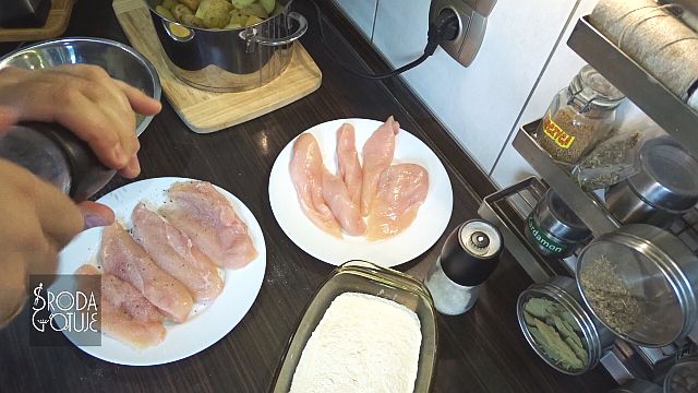 5. Naszykujmy pół szklanki mąki i na dno talerza nasypmy soli i pieprzu, będziemy układać na tym części fileta.