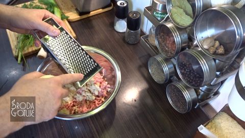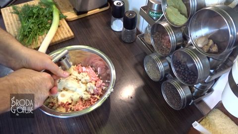 3. Trzeba chwilę odczekać, aż bułka napęcznieje i można już wszystkie składniki do mięsa dodawać: bułkę, przetartą na drobnej tarce jarzynowej cebulę