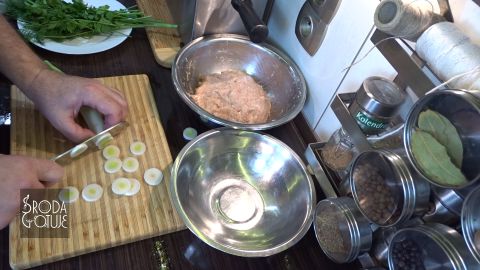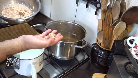 10. Jeśli bulion się zagotował to wkładamy kawałki mięsa "rwąc" je ręką. Aby mięso się nie kleiło do ręki, od czasu do czasu moczymy rękę w wodzie. Wszystkie klopsy gotujemy na wolnym ogniu 15 minut