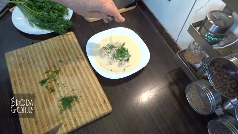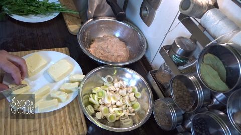 - 500 g mięsa mielonego - 1 średnia cebula - jedno duże jajo - 2 ząbki czosnku - 70 g (3-4 łyżki) tartej bułki - 1/3 szklanki mleka i 1/3 szklanki wody - 1/2 łyżeczki soli - 1/2 łyżeczki pieprzu WYWAR - 1 do 1,5 litra bulionu - dopełnić do 2,5 l wodą - 150 g drobnych pieczarek - 1 biała część pora - 4 serki topione o smaku naturalnym lub mlecznym (śmietankowym) - sól i pieprz do smaku - koper i nać pietruszki na talerz