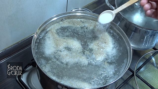 2. Gdy wywar zacznie nieco bulgotać solimy go na początek 2 czubatymi łyżeczkami soli - około 15 gramów. Trzeba delikatnie zamieszać. Nie przejmujemy się powstałymi szumami, albo się rozejdą w dalszym gotowaniu albo będzie czas aby je zdjąć.