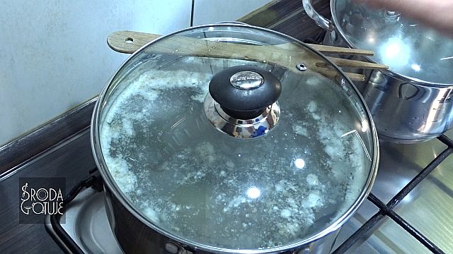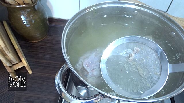 4. 2 h minęły można zdjąć szumy, służy do tego specjalna łyżka - sito z bardzo drobnymi oczkami (szumówka).