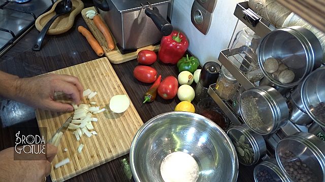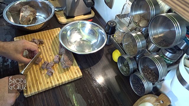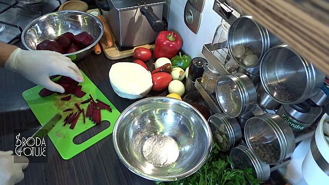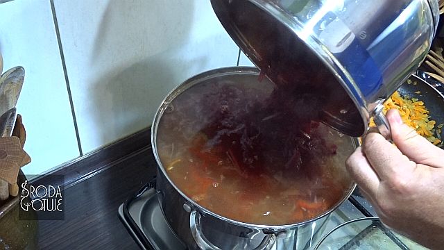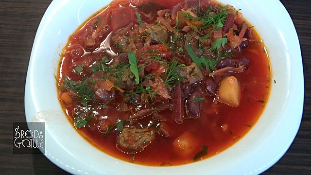 Ta narodowa zupa naszych sąsiadów jest bardzo bogata w smaku, w tym filmie prezentuje jej świąteczne wydanie, zapraszam: - 1 kg pręgi wołowej (goleń) - 4 średnie buraki (mniej niż 1 kg) - 3 duże ziemniaki (około 0,7 kg) - 3 średnie pomidory - 1 czerwona papryka i 1 mniejsza zielona - 4 średnie cebule - 2 średnie marchewki - 1/2 małej białej kapusty - 300 g gotowanej czerwonej fasoli (może być z puszki) - 2 łyżki koncentratu pomidorowego 30% - kawałek ostrej papryczki (lub pieprz cayenne) - 3 większe ząbki czosnku - po jedne garści naci pietruszki i kopru - sól, pieprz, cukier - 1 cytryna