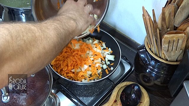 12. Na średniej patelni rozgrzewamy 2 łyżki oleju lub smalcu i smażymy cebulę z marchewką. Co jakiś czas mieszamy.
