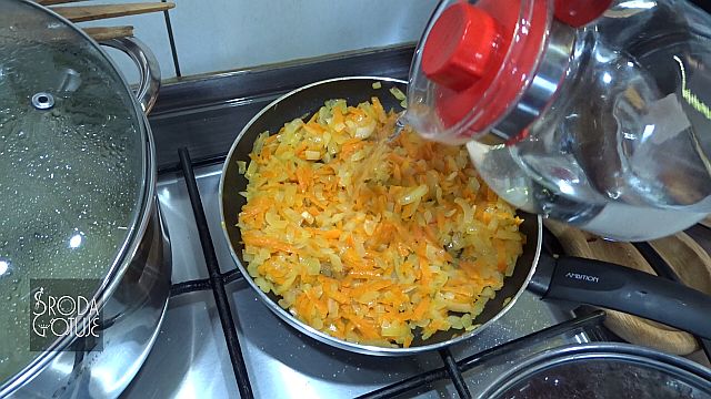 13. Smażymy 2-3 minuty na intensywnym ogniu i zalewamy kilkoma łyżkami wody, aby cebula i marchewka miały szansę się poddusić. Jak będą średnio miękkie wyłączmy palnik.