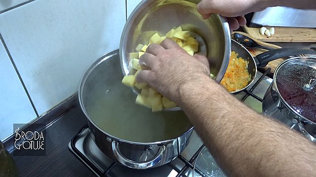 15. Dodajemy ziemniaki, które wcześniej pokroiliśmy w grubszą kostkę. Gotujemy 10 minut do czasu, kiedy zupa zacznie wrzeć.