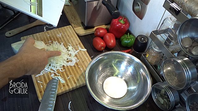 16. W międzyczasie przygotowujemy pozostałe produkty. Szatkujemy lub drobno kroimy kapustę, robiąc to tak, aby "nitki" kapusty nie były zbyt długie.