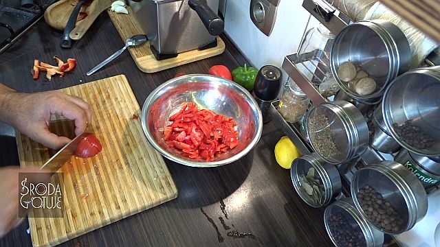 18. Kroimy paprykę w male słupki, a pomidory na połówkę, potem na pół ta połówkę i jeszcze na plasterki te ćwiartki.