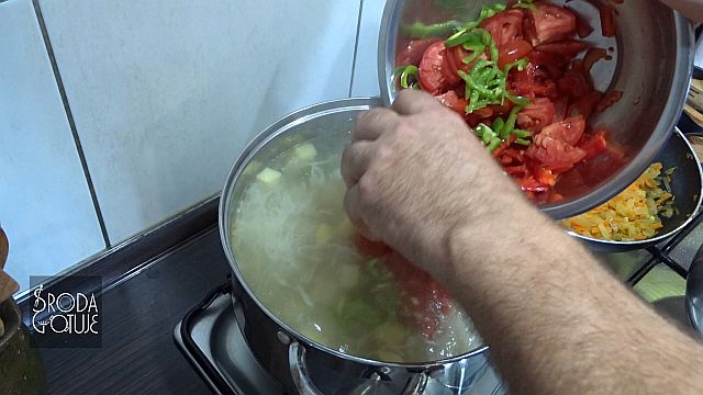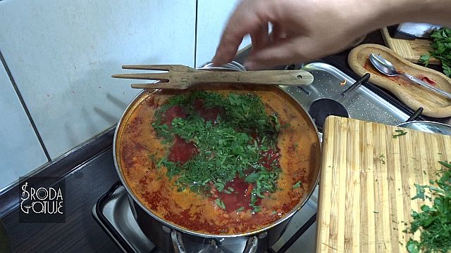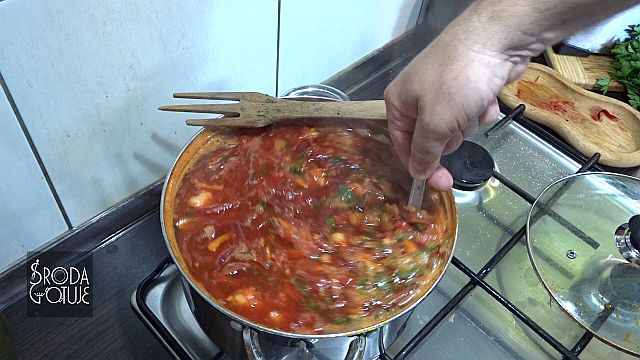 19. Zupa się zagotowała, możemy dodawać pomidory. Ponownie musi się zagotować pod przykryciem.