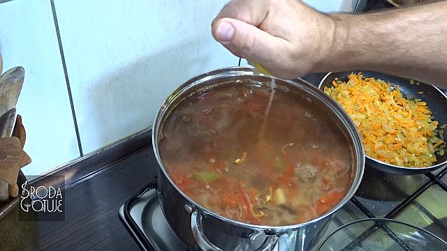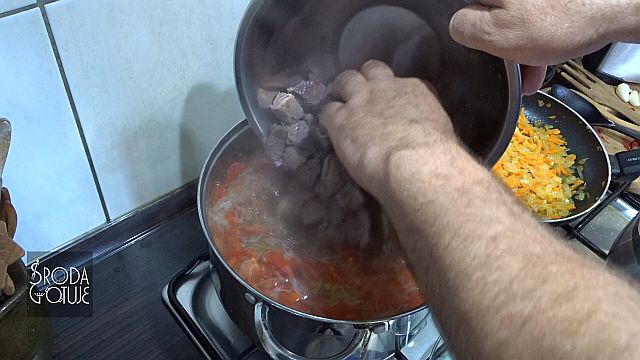 21. Zupa wrze, dodajemy mięso i zagotowujemy ją.