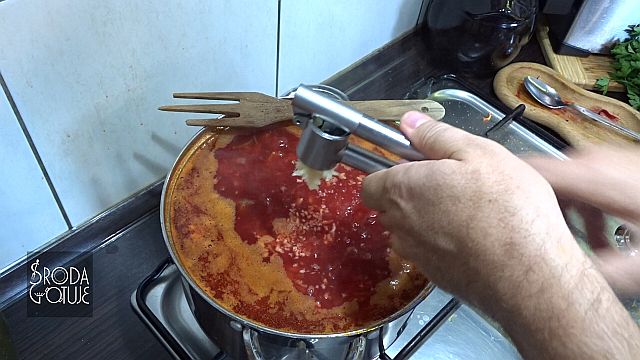 28. Dodajemy przeciśnięty przez praskę czosnek. Gotujemy 2-3 minuty.