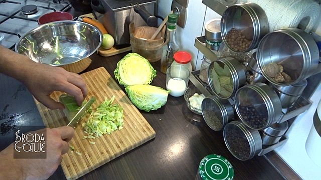 1. Kapustę kroimy na ćwiartki i każdą kroimy nożem na niezbyt grube i niezbyt długi pasemka.