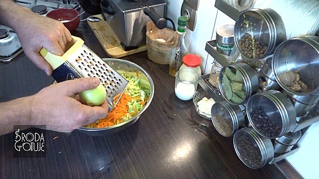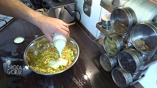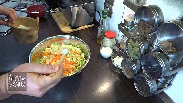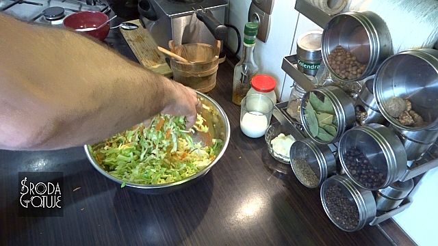 5. I mieszamy jednocześnie ugniatając łamiąc nieco poszatkowaną kapustę.