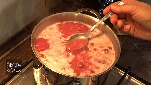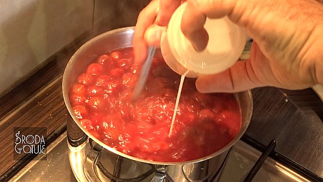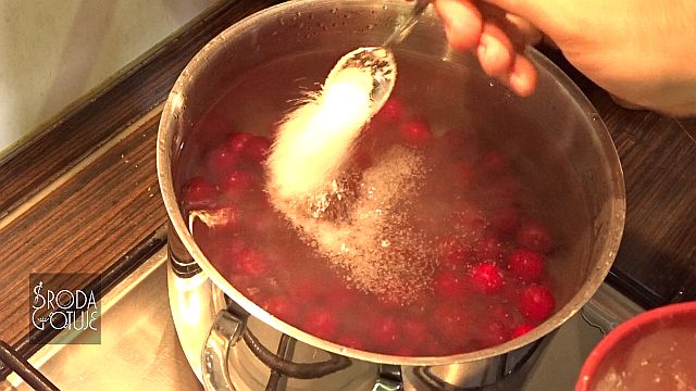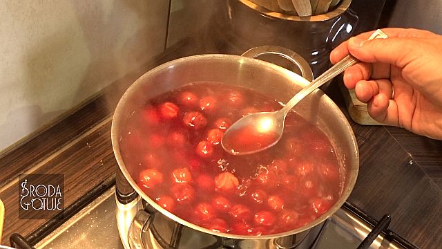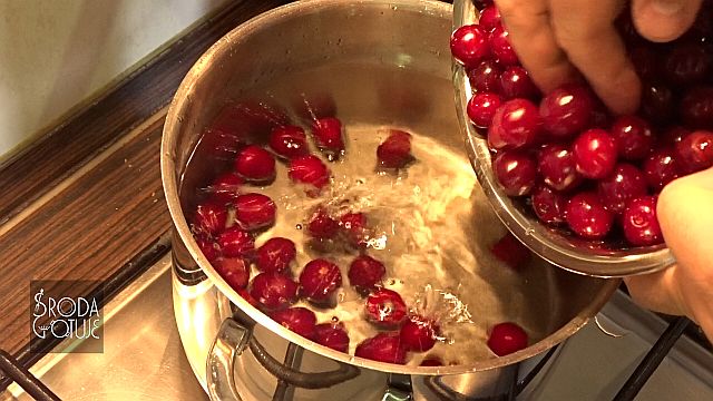 1. Do garnka wlewamy ziemną wodę i wrzucamy umyte wcześniej wiśnie.