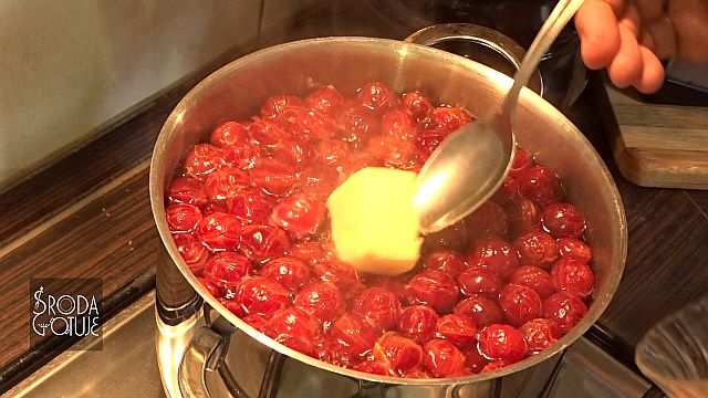 3. Sprawdzamy czy wiśnie się powoli rozgotowują, jeśli tak dodajemy masło i gotujemy 5 minut. Oczywiście od czasu do czasu trzeba zamieszać.
