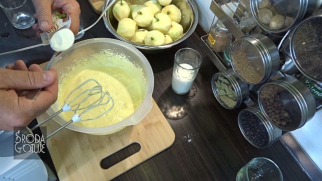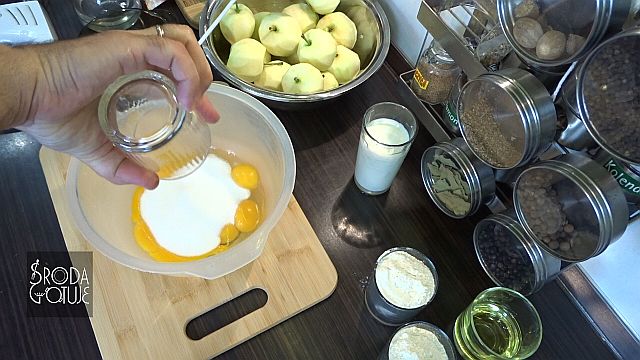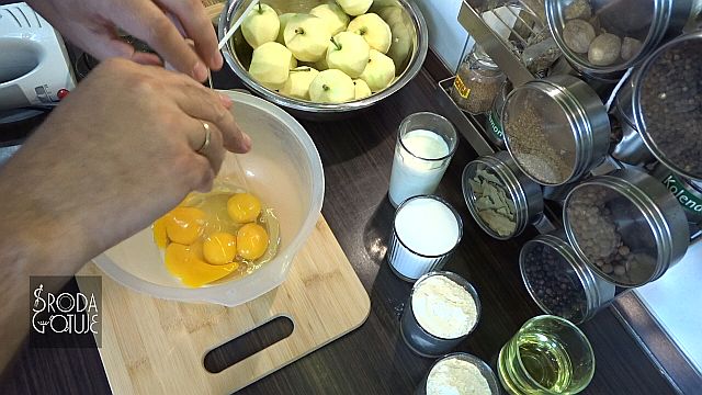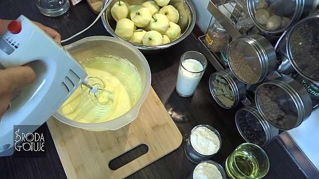 1. Zaczynamy od obrania jabłek, można je od razu pokroić na szóstki lub zrobić po ukręceniu ciasta. Jabłka obrane to wybijamy 3 żółtka i 2 całe jaja do miski, w której będziemy miksować.