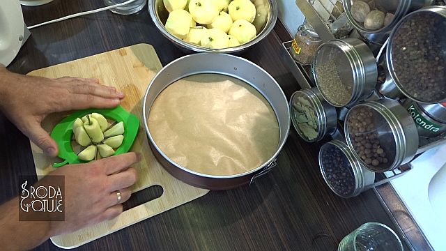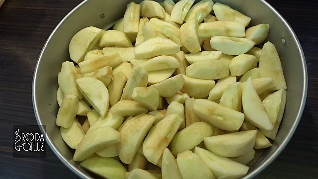10. Wszystkie jabłka lądują w formie do ciasta. Nie układamy ich, ani nie ubijamy, powinny zostać szczeliny.