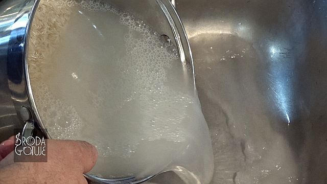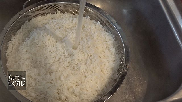 3. Gdy ryż będzie miękki, ale nie rozgotowany szybko wylewamy zawartość na cedzak i przelewamy go zimną wodą, szczególnie mocno w środkowej części, to zapobiegnie dalszemu samoczynnemu rozgotowaniu się ryżu.