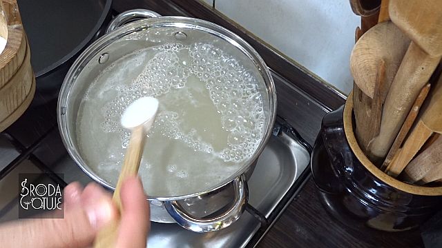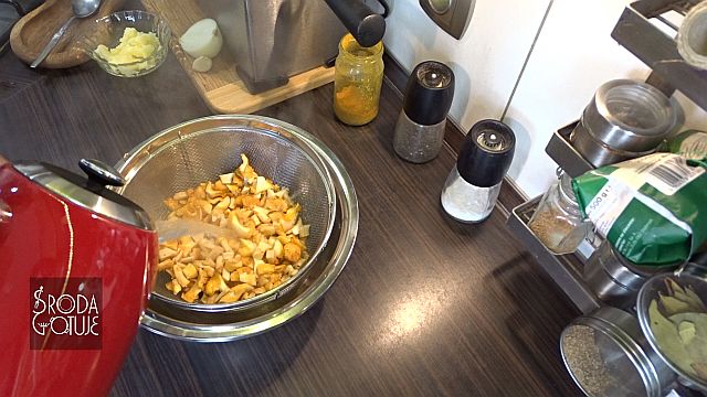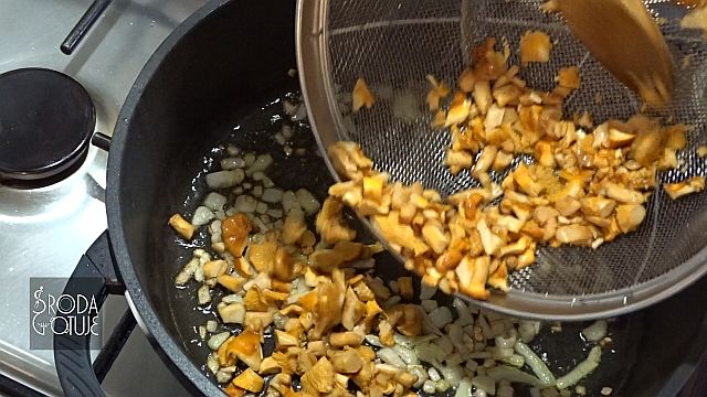 5. Teraz należy kurki sparzyć. Ta czynność ma na celu trzy zadania, po pierwsze kurki zostaną dokładniej umyte, dlatego parzymy je na sicie o większych oczkach lub bezpośrednio w wodzi wyjmując później łyżką cedzakową, po drugie parzenie wstępnie wygoni z kurek różnego rodzaju drobnoustroje i zarazki, a po trzecie będą smaczniejsze, gdyż pieprznik jadalny (poważna nazwa kurki) jest nieco gorzkawy i wrzątek zmniejszy ta goryczkę.