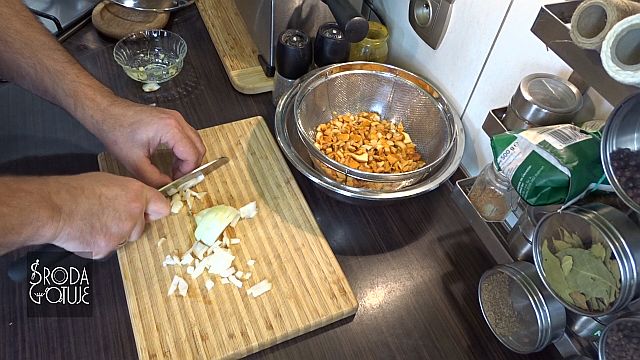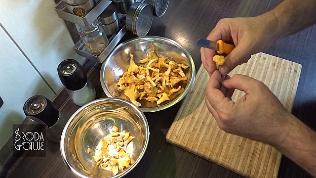 4. Możemy zając się grzybami. Trzeba je wstępnie oczyścić z grubszych paprochów i pokroić na mniejsze kawałki. Co pomniejsze łebki kurek można zostawić w całości.