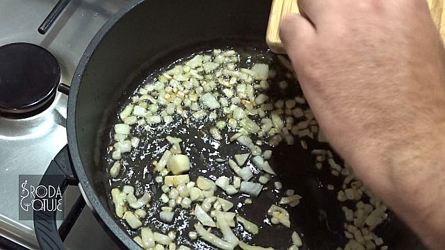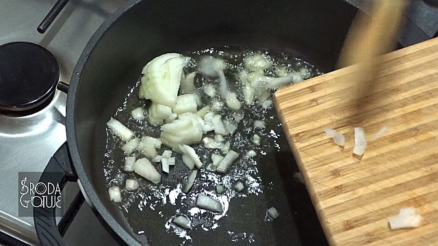8. Tłuszcz rozgrzany możemy smażyć cebulę (ale nie czosnek), robimy to na dużym ogniu, bardzo intensywnie, trzeba prawie ciągle mieszać.