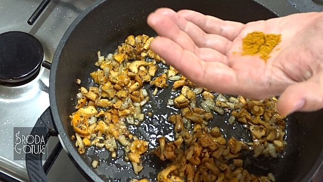 11. Od razu trzeba je dobrze popieprzyć i dodać szczyptę curry. Kurki smażymy około 3 minut na dużym ogniu, co kilkanaście sekund mieszając.
