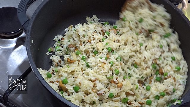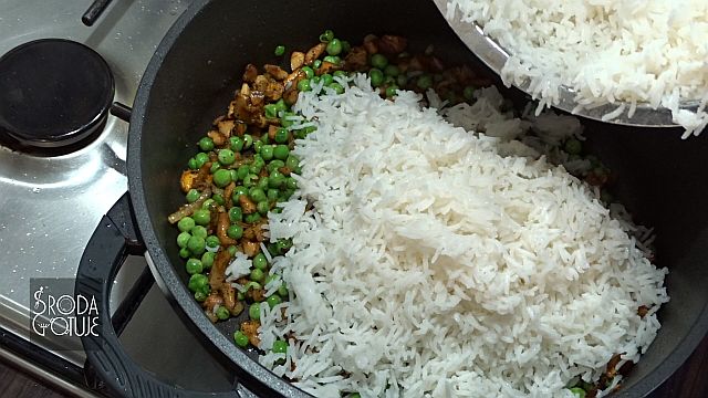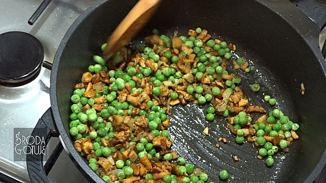 12. Można dodać groszek, musi być prosto z zamrażalnika (chyba, że macie świeży), smażymy do czasu, aż groszek zacznie robić się rumiany i pękać.