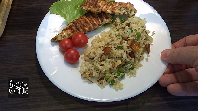 Proste w swoim składzie, niesamowite w smaku, szybkie danie sezonowe: - 350 g ryżu basmati (posolić 1 i 1/2 łyżeczki) - miseczka kurek leśnych, około 100 g - 100 g zielonego groszku mrożonego - 2 łyżki masła klarowanego - połowa dużej cebuli lub 1 mniejsza - 1 duży ząbek czosnku - 1/2 łyżeczki pieprzu świeżo mielonego - max 1/3 łyżeczki soli - 1/3 łyżeczki przyprawy curry