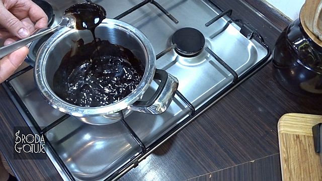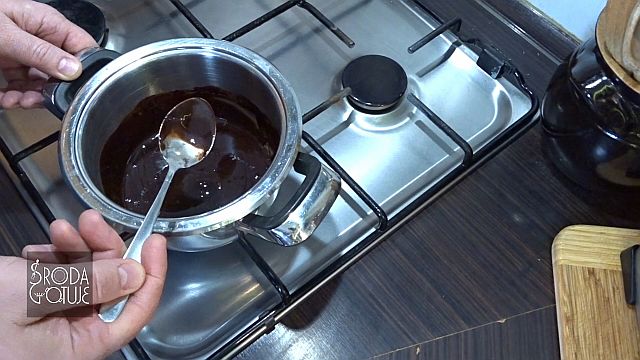 4. Teraz czekamy, aż polewa ostygnie do około 40 st. C, będzie jeszcze płynna, ale nie będzie parzyć w usta i smarujemy ciasto lub ciastka. Teraz warto polewę na cieście schłodzić, aby zrobiła się sztywniejsza. Polewa w temperaturze pokojowej jest miękka, wilgotna i pyszna.