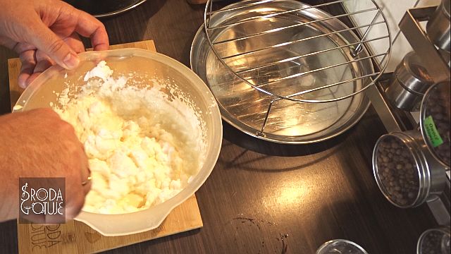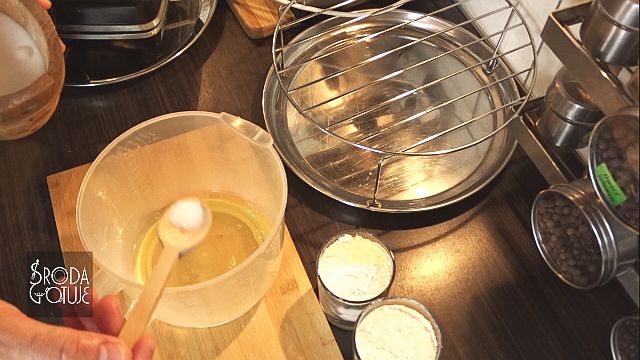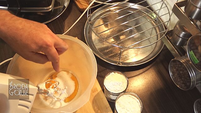 5. Do pojemnika z żółtkami wsypujemy cukier wanilinowy i miksujemy na jednolitą pulchną masę.