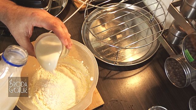 6. Do masy z żółtek dodajemy mąkę, proszek do pieczenia i mleko.