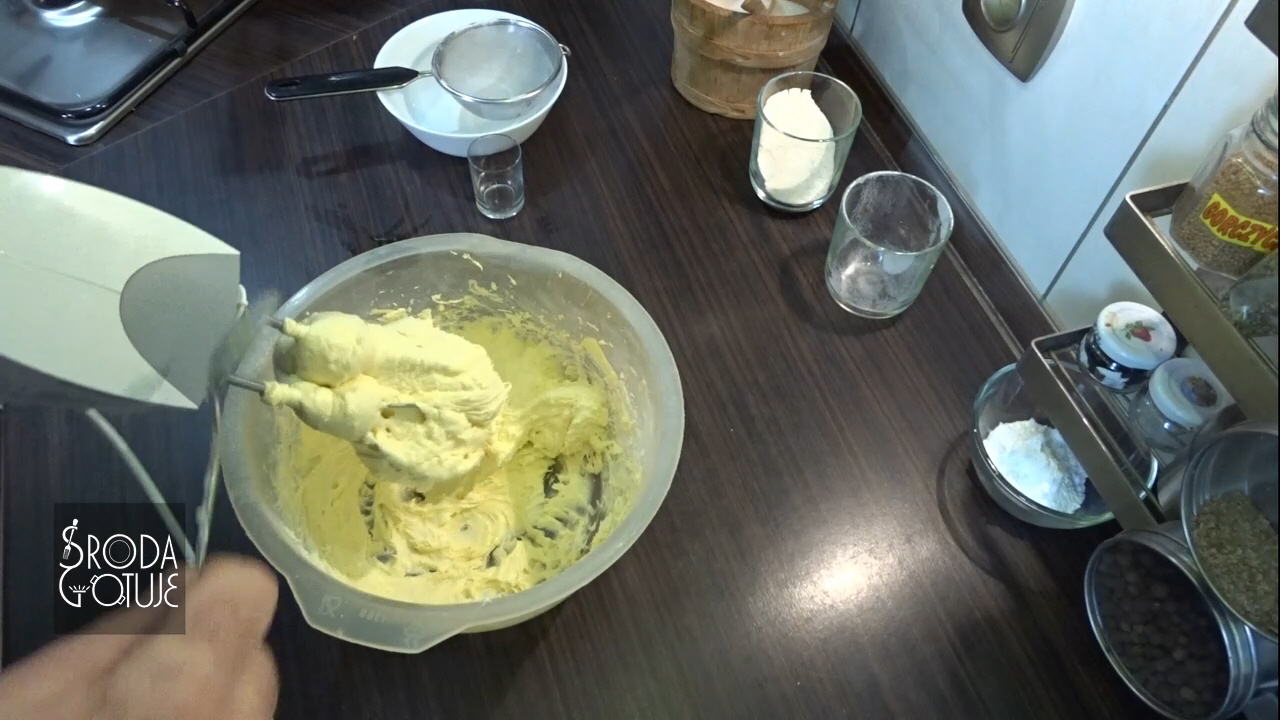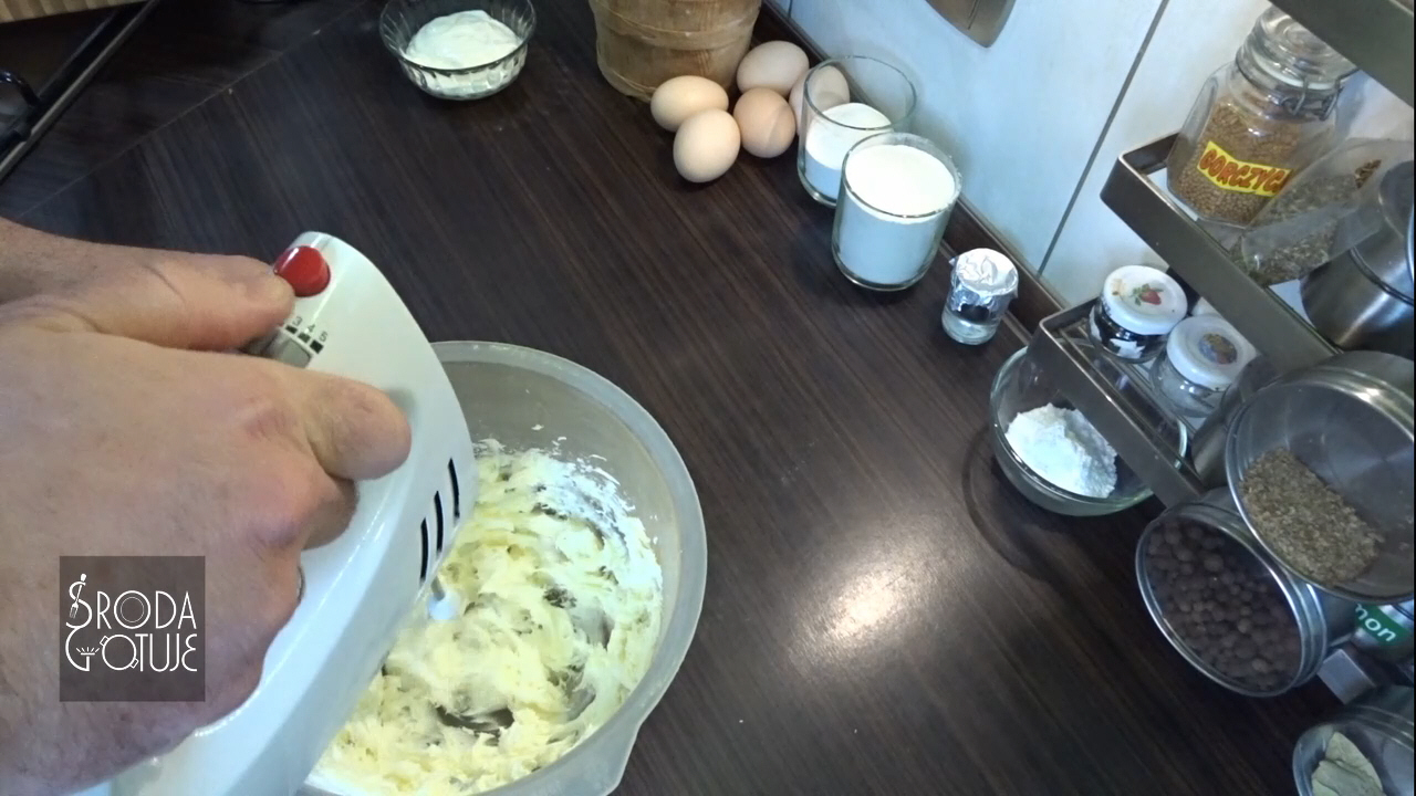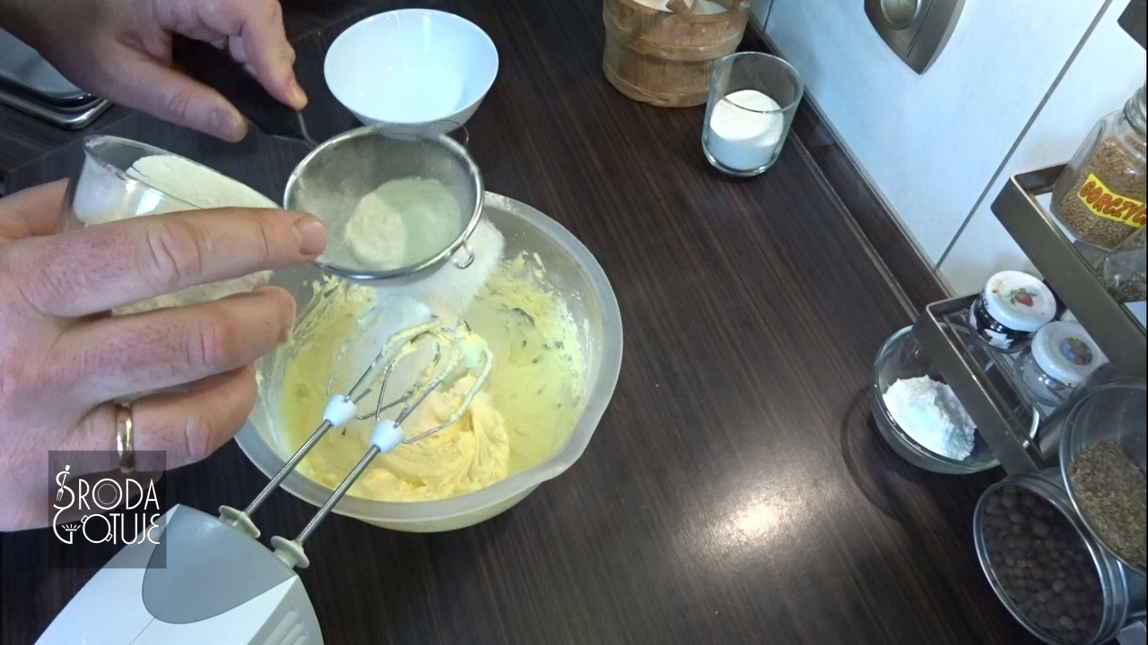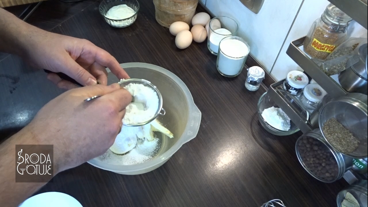 2. Przesiewamy i kręcimy mikserem na najwyższych obrotach, przesiewamy kolejne kilka łyżek i kręcimy. Powinna powstać pulchna masa.