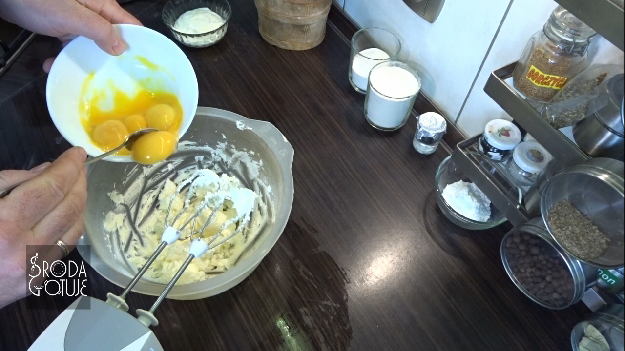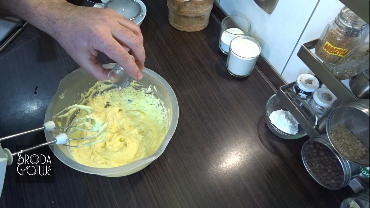 3. Teraz dodajemy po jednym żółtku, które wcześniej warto wybić do miseczki lub szklanki, za każdym razem kiedy dodamy żółtko, chwilę miksujemy, po ostatnim żółtku miksujemy trochę dłużej.