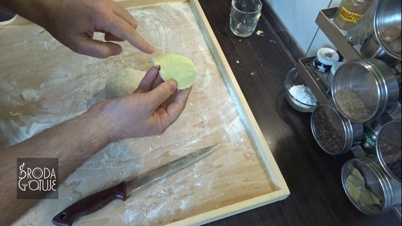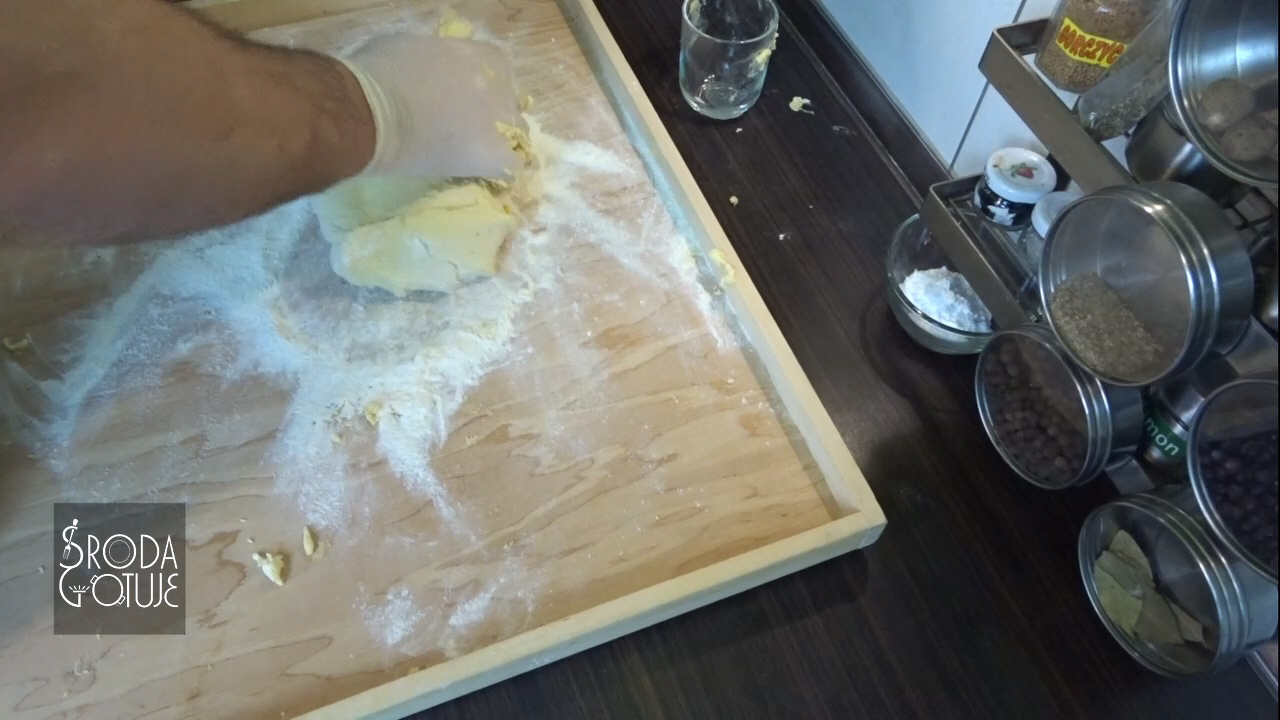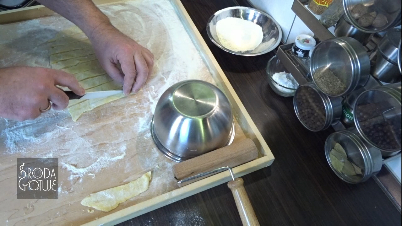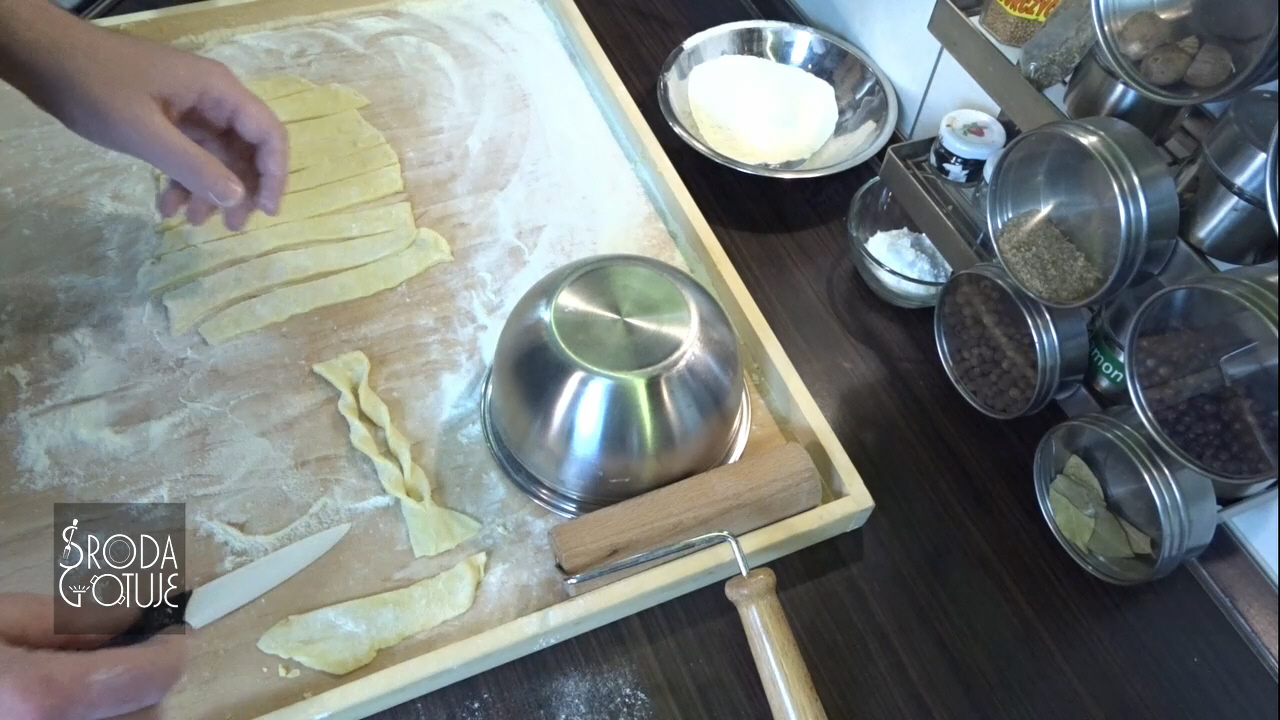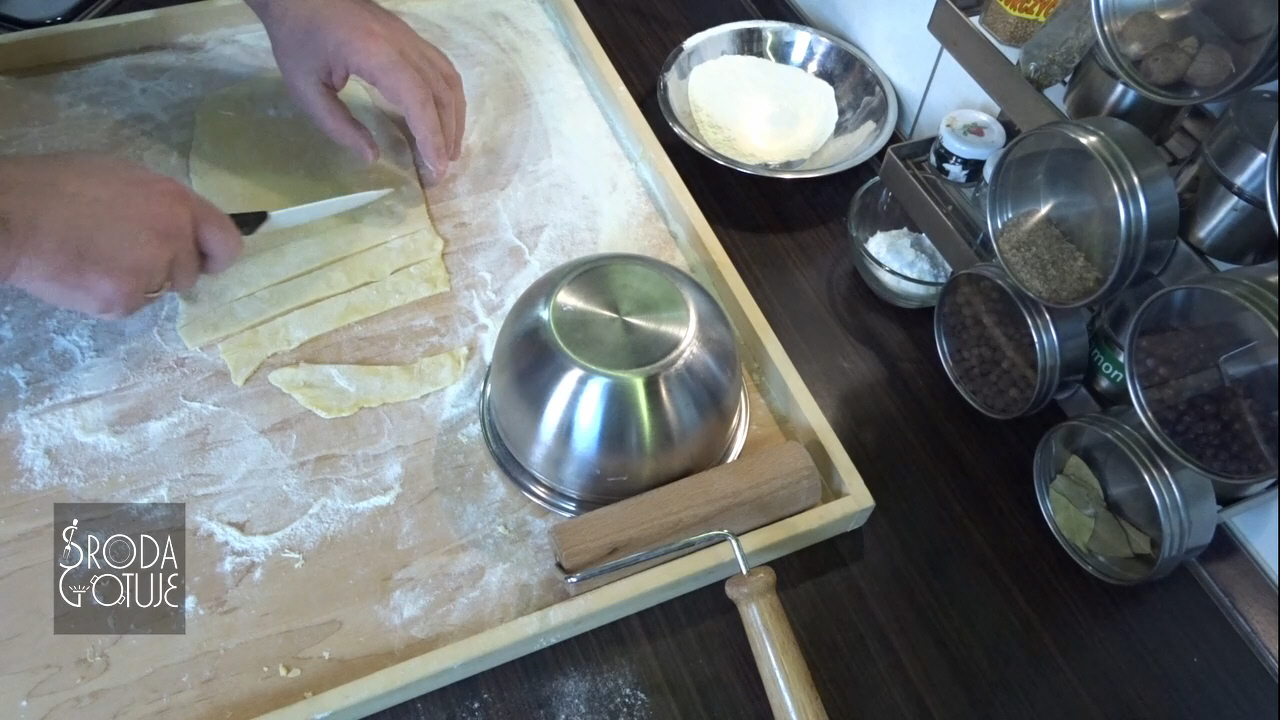 13. Przy pomocy wałka do ciasta, formujemy cienkie na 1 do 1,5 mm placki, które tniemy na 2 cm paseczki.