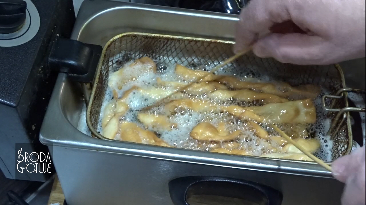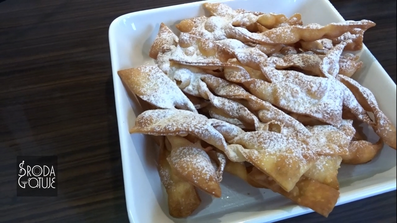 Wspaniałe, kruche, lekkie i bardzo smaczne, a wszystko to bez proszku do pieczenia: - 80 g masła - 60 g cukru pudru (do ciasta) - 5 żółtek - 3 łyżki kwaśnej, gęstej śmietany (12 lub 18%) - szczypta soli - łyżka spirytusu - od 250 do 350 g mąki tortowej - cukier puder do posypania - olej lub smalec do smażenia Smażyć tak długo aby były dobrze rumiane :)