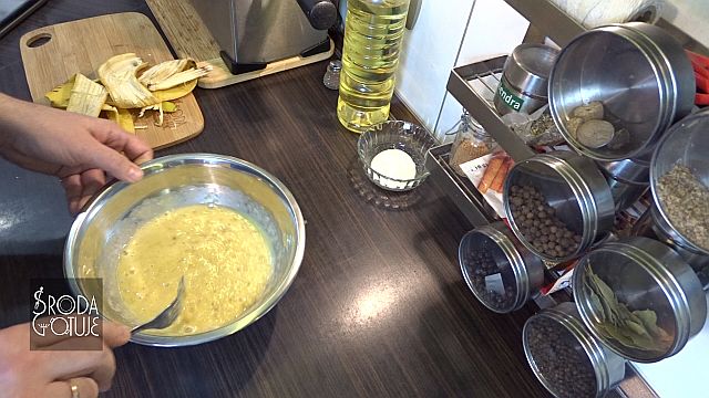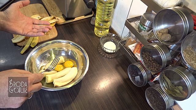 2. Do miski w której są banany, wbijamy 2 całe jaja. Teraz za pomocą zwykłego widelca rozgniatamy banany razem z jajkami.
