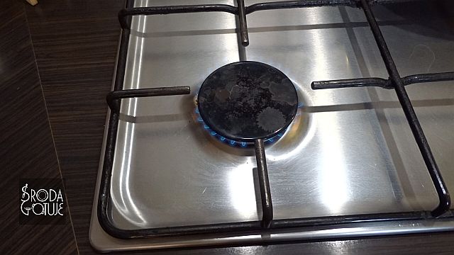 4. Podpalamy nasz największy palnik i robimy mały płomień, chodzi o to aby temperatura na patelni rozchodziła się równomiernie, ale racuszki nie mogą smażyć się zbyt gwałtownie (jeśli ktoś ma kuchnię elektryczną lub indykcyjną to zasada jest podobna). Stawiamy na palniku patelnię i dobrze ją rozgrzewamy na sucho!