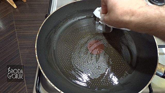5. Rozgrzaną patelnię smarujemy ręcznikiem papierowym nasączonym w oleju roślinnym.