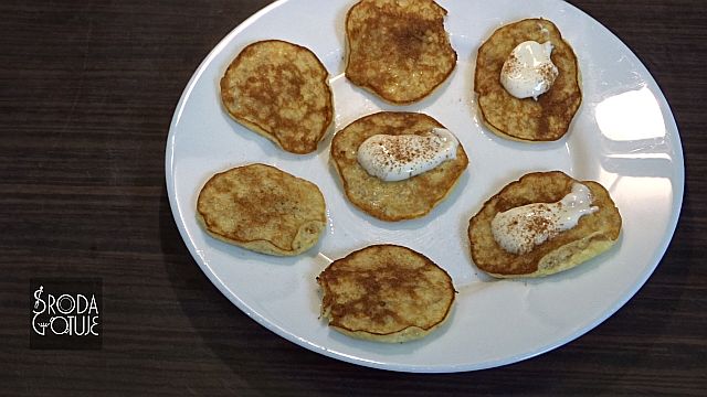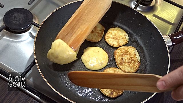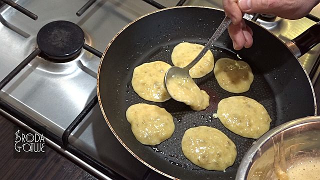6. Mieszamy łyżką w masie na racuszki i małymi placuszkami wylewamy na patelnię.