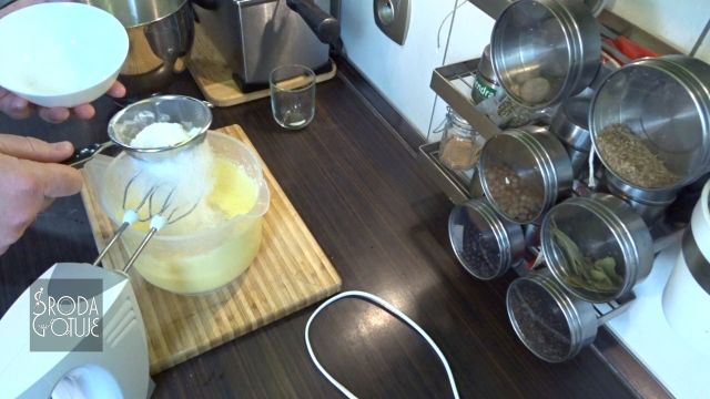 5. Teraz obie mąki przesiewamy przez sitko prosto do naszej masy i ponownie miksujemy mniej niż minutę