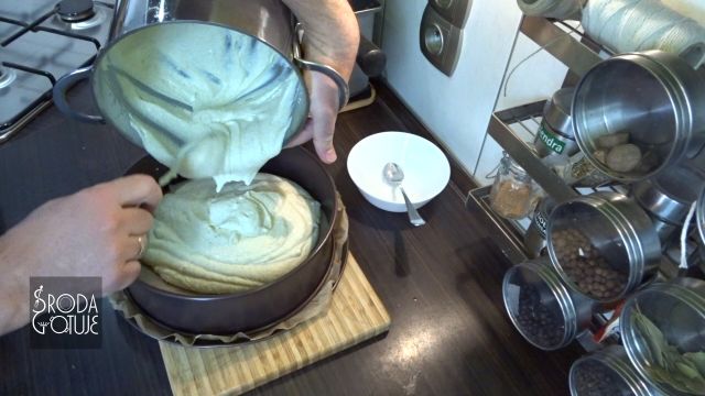 7. Na okrągłą tortownicę (18-20 cm średnicy), lub średnią blachę do pieczenia wyłożoną na spodzie papierem do pieczenia, wylewamy masę serową (która już teraz jest pyszna!)
