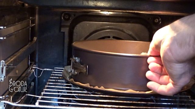 8. Nareszcie do piekarnika: nagrzewamy do 170-180 st.C i po włożeniu sernika zmniejszamy ją do 150 st. i tak niech piecze się 1 h i 30 minut. Sernik lubi usiąść, można próbować temu zapobiec wyłączając piekarnik i zostawiając go tam do przestygnięcia nawet 1 h.