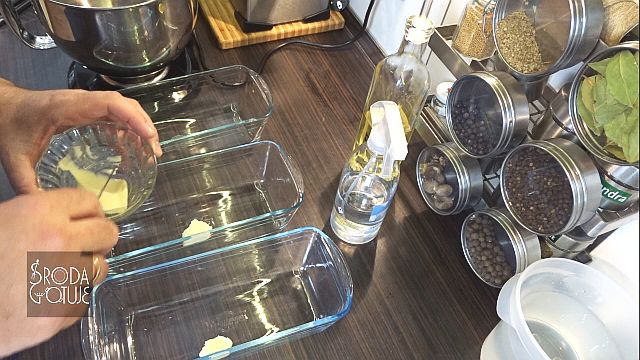 1. Przygotowanie chleba jest proste :) zakładając, że posiadamy zakwas na chleb. Na początek trzeba przygotować formy, mogą to być formy szklane jak w tym przepisie, mogą być formy gliniane lub nawet metalowe keksówki, te ostatnie trzeba wyłożyć papierem do pieczenia. Form glinianych oraz metalowych nie trzeba smarować masłem i wysypywać ziarnami. Smarujemy nasze szklane formy miękkim masłem.