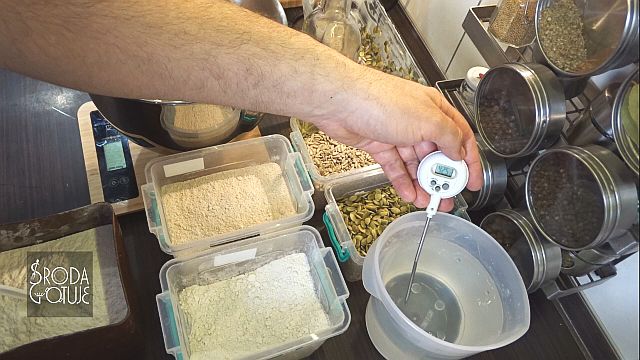 3. Trzeba zadbać też aby woda miała nie odpowiednią temperaturę. Jeśli zakwas był wcześniej dokarmiony i stał w temperaturze pokojowej, wystarczy, że woda ma nieco ponad 40 st.c, natomiast jeśli zakwas był z lodówki trzeba naszykować wodę minimum 50 st. C aby zrównoważyć chłód zakwasu.