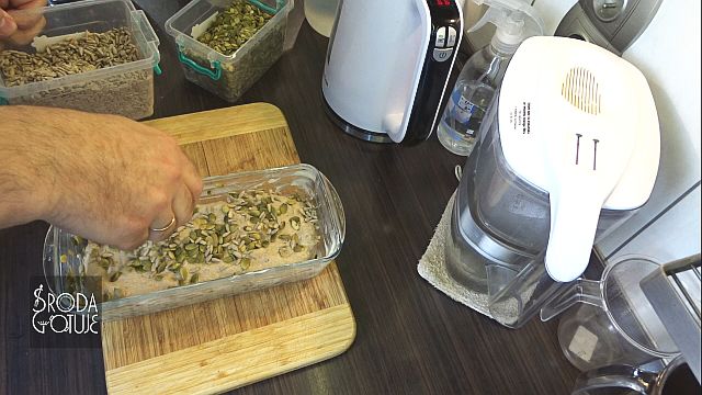 10. Dla ozdoby, a przede wszystkim dla smaku posypujemy przygotowane ciasto po wierzchu ziarnami, lekko je przygniatając do ciasta. Tak przygotowujemy tyle chlebów ile nam się podoba i zostawiamy je do wyrośnięcia. Należy nakryć je lnianą lub bawełnianą ściereczką i zostawić, aż przynajmniej jeden z nich urośnie do brzegów formy. Czas wzrastania zależy od wielu czynników i może to trwać od 3 nawet do 10 godzin! Pomocne może być umieszczenie chlebów do wyrastania do wcześniej nagrzanego piekarnika do 50 st. Uwaga po włożeniu chlebów do wyrastania piekarnik należy wyłączyć i zamknąć.
